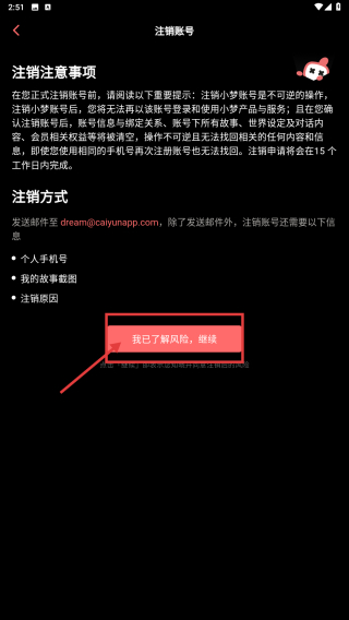 4、閱讀注銷(xiāo)注意事項(xiàng)后,點(diǎn)擊我已了解風(fēng)險(xiǎn),繼續(xù)按鈕進(jìn)行注銷(xiāo)操作。