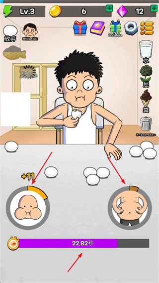 2、在規(guī)定時間內(nèi),讓角色與雞蛋等物品互動,積累分?jǐn)?shù),同時留意相關(guān)進度條變化。