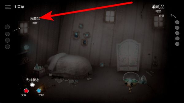 2、界面左側(cè)有收藏品欄,可通過拖放操作來整理收集到的物品,這些收藏品或許在后續(xù)解謎過程中起到重要作用,要仔細收集并妥善管理。