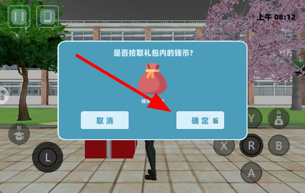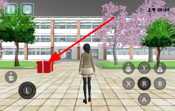3、玩家在校園里尋找紅色禮包盒子,找到后靠近它,準(zhǔn)備開(kāi)啟禮包獲取里面的物品。