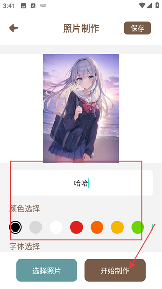 4、在照片制作頁(yè)面,輸入文字,選擇顏色,點(diǎn)擊開(kāi)始制作,即可生成帶照片的簽名。