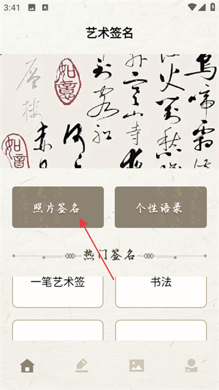 1、進(jìn)入藝術(shù)簽名頁(yè)面,點(diǎn)擊照片簽名,進(jìn)入照片制作頁(yè)面。