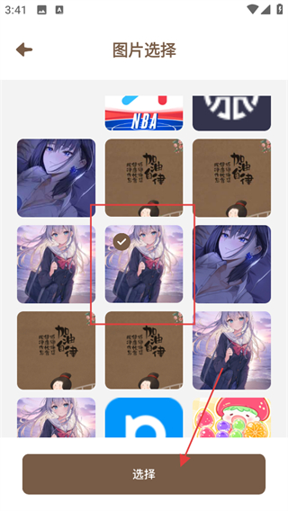 3、在圖片選擇頁(yè)面,選中想要的圖片后,點(diǎn)擊選擇,回到照片制作頁(yè)面。