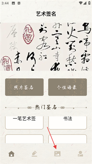 1、進(jìn)入藝術(shù)簽名頁(yè)面,點(diǎn)擊底部圖片圖標(biāo),進(jìn)入藝術(shù)壁紙頁(yè)面。