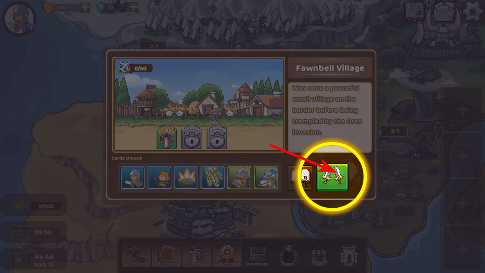 1、進(jìn)入新的關(guān)卡,點(diǎn)擊關(guān)卡入口按鈕,進(jìn)入Fawnbell Village關(guān)卡,開(kāi)啟戰(zhàn)斗挑戰(zhàn)。