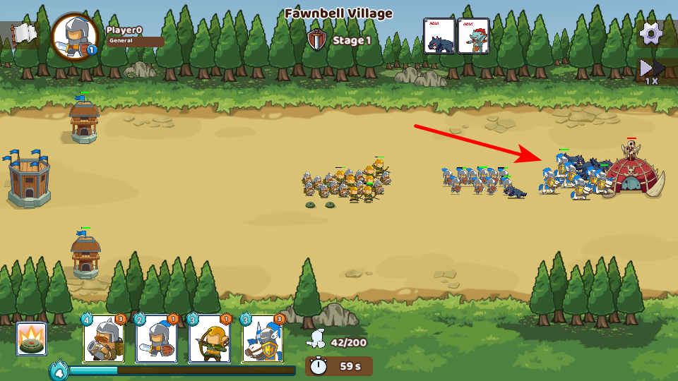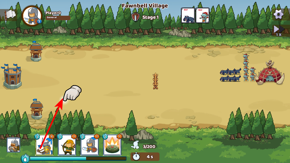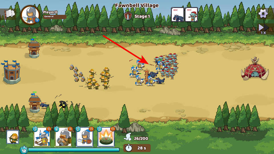 2、部署士兵,在戰(zhàn)斗界面點(diǎn)擊士兵卡牌,將士兵部署到戰(zhàn)場(chǎng)指定位置,形成戰(zhàn)斗陣型。