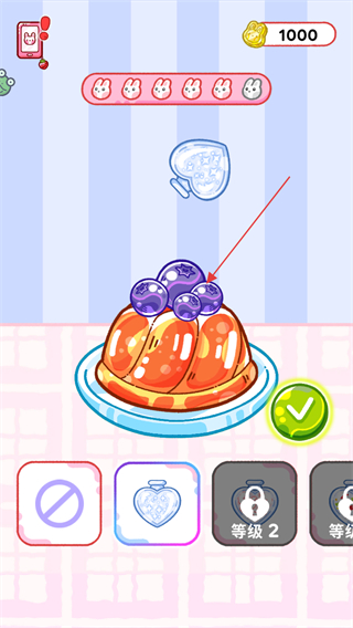 4、攪拌完成,給果凍添加裝飾如紫色果粒,點(diǎn)擊綠色對勾按鈕提交,滿足觀眾請求獲取獎勵,完成關(guān)卡。