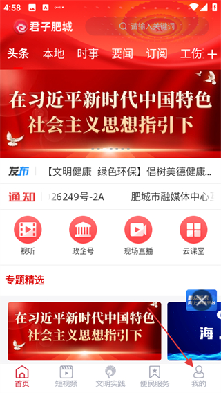 1、進(jìn)入君子肥城首頁(yè),點(diǎn)擊底部我的,進(jìn)入個(gè)人頁(yè)面。