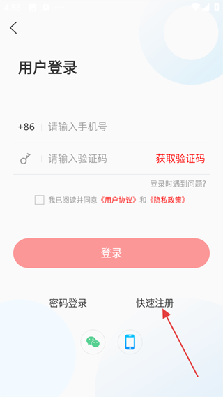 3、在用戶登錄頁(yè)面,若沒有賬號(hào),點(diǎn)擊快速注冊(cè),進(jìn)入用戶注冊(cè)頁(yè)面。