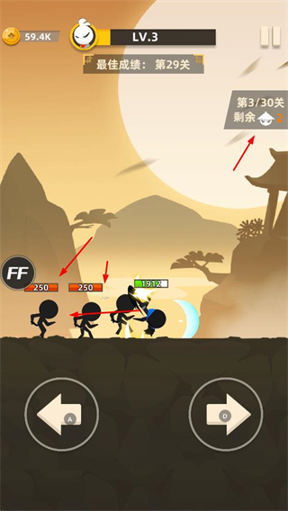 1、在戰(zhàn)斗場(chǎng)景中,操控火柴人在關(guān)卡中與敵人戰(zhàn)斗,界面會(huì)顯示剩余敵人數(shù)量,擊敗敵人推進(jìn)關(guān)卡。