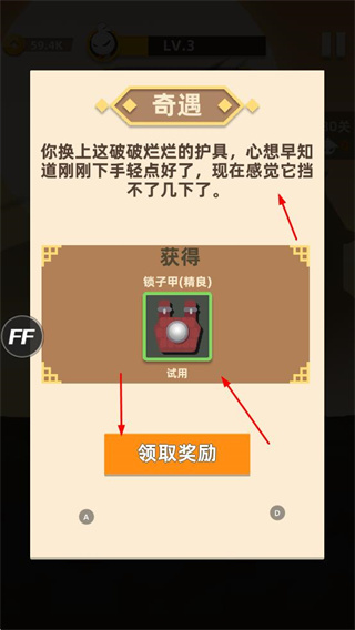 2、會(huì)有奇遇,可獲得如鎖子甲等裝備,點(diǎn)擊領(lǐng)取獎(jiǎng)勵(lì)獲取,試用裝備提升戰(zhàn)斗防御等能力。