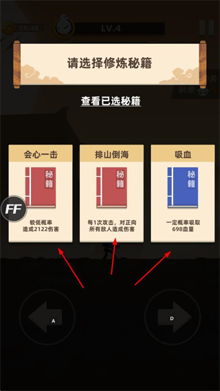 3、選擇修煉秘籍,有會(huì)心一擊、排山倒海、吸血等,助力戰(zhàn)斗。