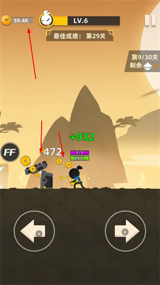 4、戰(zhàn)斗時(shí),火柴人攻擊敵人可造成傷害并獲取金幣等獎(jiǎng)勵(lì),界面會(huì)顯示最佳成績(jī)等關(guān)卡信息。