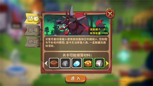 1、在關(guān)卡選擇界面,查看關(guān)卡信息如怪物介紹、消耗精力值、掉落數(shù)量加成,點擊進入開啟關(guān)卡。