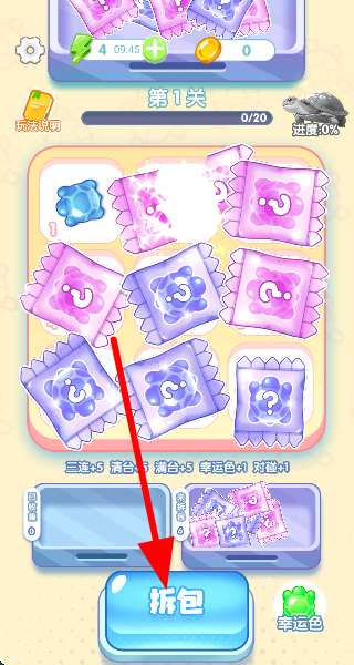 3、進入拆包環(huán)節(jié),點擊拆包按鈕,對包裹進行拆分,然后通過消除相同圖案的包裹來推進關(guān)卡。