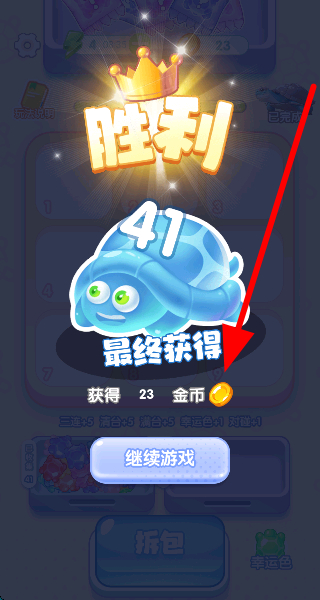 4、成功消除包裹完成關(guān)卡后,會顯示勝利畫面,獲得金幣等獎勵,之后可點擊繼續(xù)游戲挑戰(zhàn)新關(guān)卡。