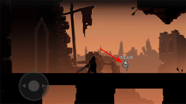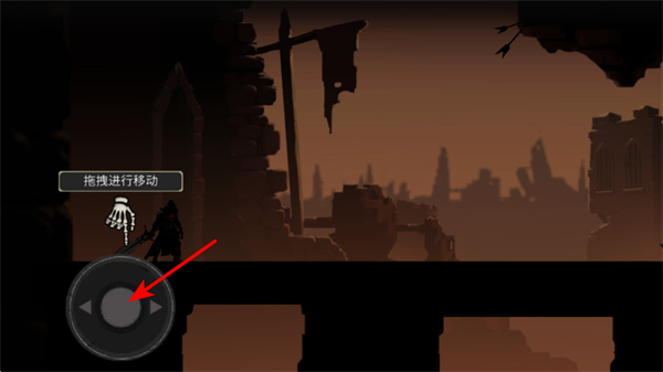 2、操控移動,通過虛擬方向鍵拖拽進行移動,在廢墟場景中操控角色移動,接近區(qū)域。