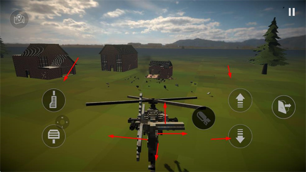 1、可操控直升機,利用界面上的方向按鈕調(diào)整飛行方向和高度,向brick建筑發(fā)起攻擊,破壞建筑。