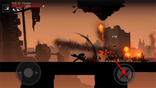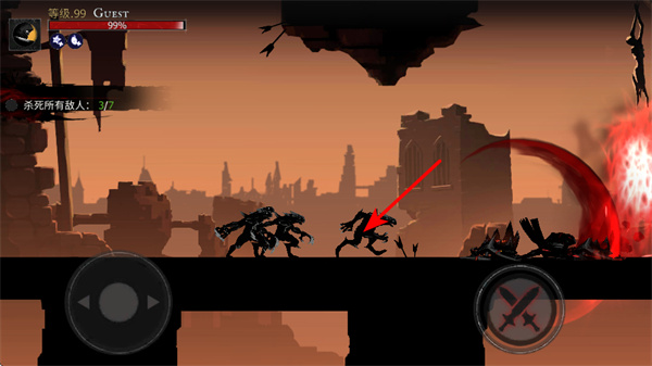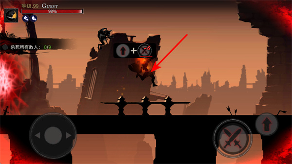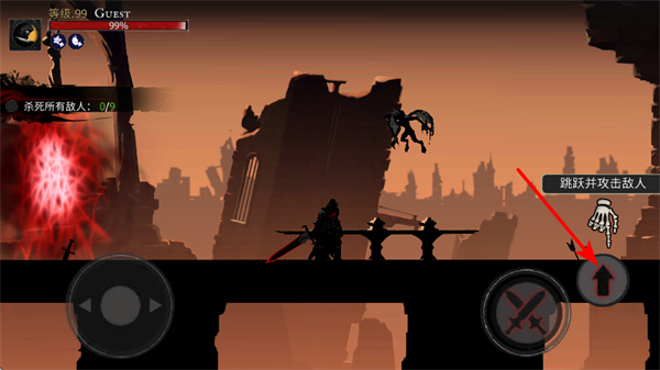 3、跳躍攻擊點(diǎn)擊跳躍按鈕,跳躍并攻擊敵人,可對空中或高處的敵人造成傷害,拓展范圍。