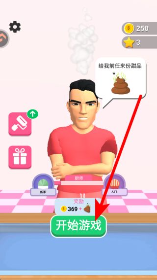 1、進入游戲后,點擊開始游戲,會收到顧客的訂單,比如有顧客想要一份搞怪的便便形狀甜品,此時需根據(jù)需求準備制作。