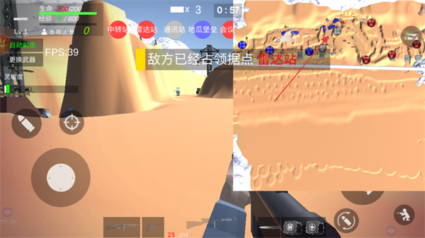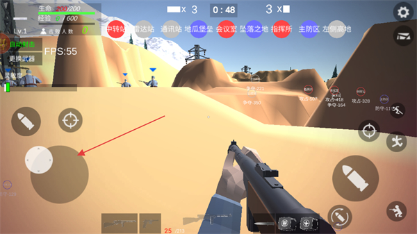 2、點(diǎn)擊左下方移動(dòng)按鈕操控角色,在沙漠場景中移動(dòng)尋找敵人。