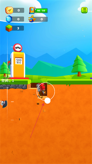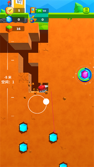 1、進(jìn)入游戲,查看屏幕上方資源數(shù)值,操控鉆頭挖掘地下方塊。