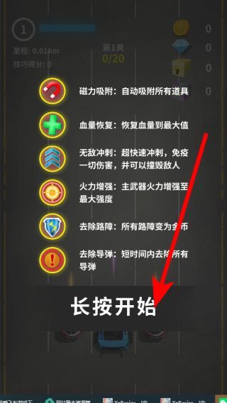 1、開局長(zhǎng)按開始按鈕啟動(dòng)賽車,賽道上會(huì)出現(xiàn)磁力吸附恢復(fù)血量無敵沖刺等道具等提示,長(zhǎng)按即可開始游戲。
