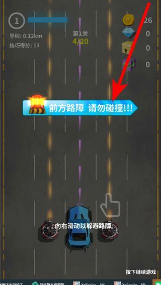 2、行駛時(shí)要留意前方提示,若有前方路障請(qǐng)勿碰的警示,需滑動(dòng)屏幕調(diào)整賽車位置躲避,路障會(huì)阻礙賽車前進(jìn),碰撞后可能導(dǎo)致闖關(guān)失敗。