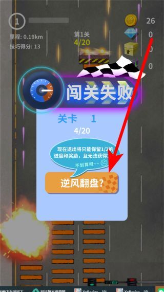 4、若不慎碰撞路障闖關(guān)失敗,會(huì)彈出提示框,此時(shí)可選擇逆風(fēng)翻盤按鈕,嘗試重新挑戰(zhàn),不過退出的話只能保留部分進(jìn)度和獎(jiǎng)勵(lì),還無法獲得本次關(guān)卡的全部收益。