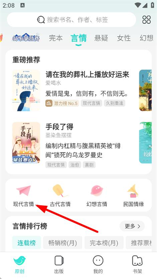 1、在小說(shuō)軟件首頁(yè),點(diǎn)擊現(xiàn)代言情,進(jìn)入言情小說(shuō)列表頁(yè)面。