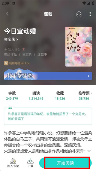 3、在小說(shuō)詳情頁(yè)面,點(diǎn)擊開(kāi)始閱讀,進(jìn)入小說(shuō)閱讀頁(yè)面。