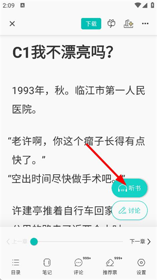 4、在小說(shuō)閱讀頁(yè)面,點(diǎn)擊聽(tīng)書(shū),可切換為聽(tīng)書(shū)模式收聽(tīng)小說(shuō)內(nèi)容。