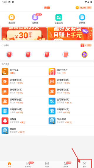 1、打開米賺APP,點(diǎn)擊底部我的選項(xiàng),進(jìn)入個(gè)人中心頁面。