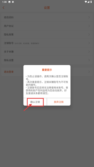 4、在重要提示彈窗里,點(diǎn)擊確認(rèn)注銷按鈕,完成賬號(hào)注銷操作。
