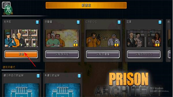 1、在主界面選擇光明紀(jì)等可開啟的游戲模式,點(diǎn)擊開始按鈕,進(jìn)入監(jiān)獄建造的游戲場(chǎng)景。