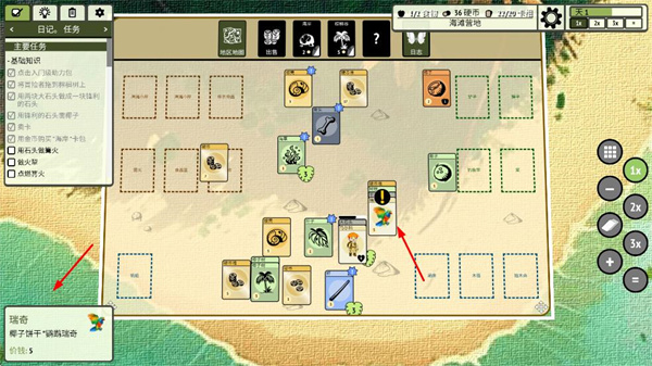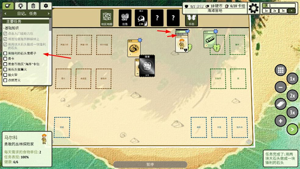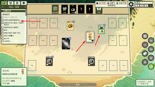 1、在游戲界面中,可查看基礎(chǔ)知識任務(wù),如在倉庫入門牌左方、考古點左方等位置放置特定卡牌。