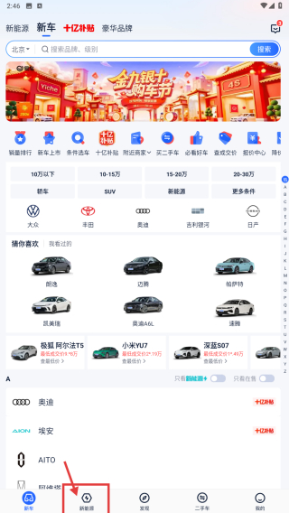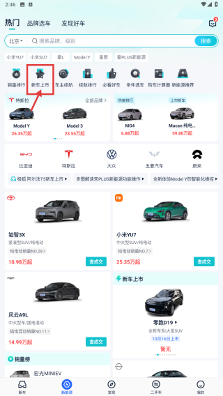 1、打開汽車類APP,點擊底部選車選項,進(jìn)入選車頁面后,點擊新車上市分類,查看近期上市的新車列表。