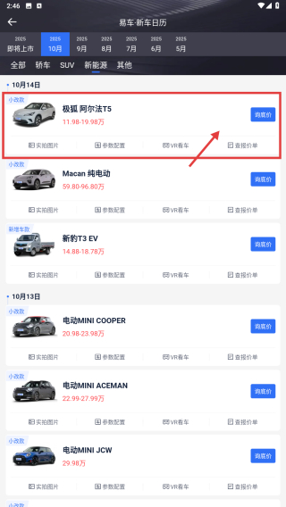 2、在新車上市列表中,點擊極氪阿爾法T5車型條目,進(jìn)入該車型詳情頁面。