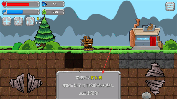 1、進(jìn)入游戲,閱讀提示信息,明確目標(biāo)是操控挖掘機(jī)向下挖得越深越好,點(diǎn)擊屏幕繼續(xù)游戲。