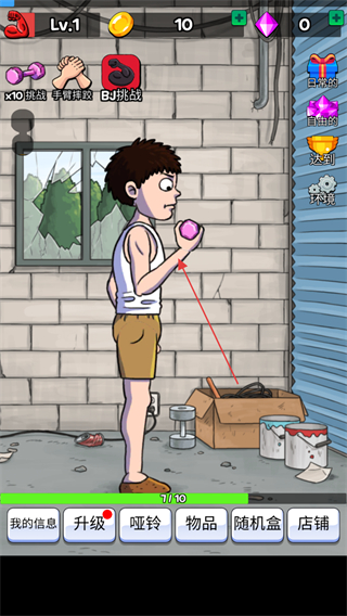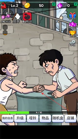 2、使用金幣如初始的10金幣,點(diǎn)擊升級(jí)按鈕,提升角色掰手腕的能力。