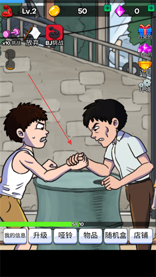 4、在掰手腕過(guò)程中,按照游戲提示操作,爭(zhēng)取壓制對(duì)手,獲得勝利,完成任務(wù)目標(biāo)如5/10。