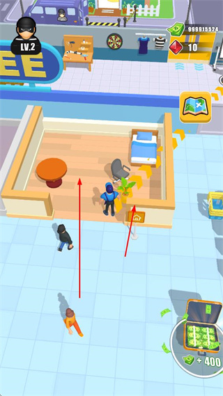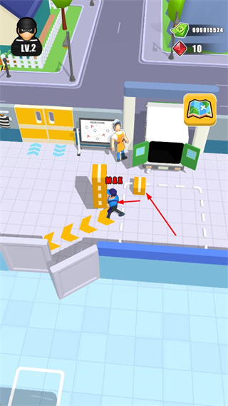 1、在游戲場景中,操控小偷角色收集道具,提升角色等級,界面顯示資源數(shù)量。