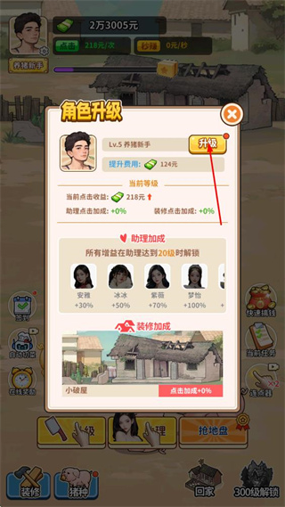 2、可對(duì)角色進(jìn)行升級(jí),提升點(diǎn)擊收益和等級(jí),消耗金幣進(jìn)行升級(jí)操作,同時(shí)助理和裝修也能帶來(lái)收益加成。