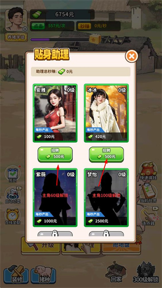 3、招聘貼身助理,不同助理每秒產(chǎn)出的金幣數(shù)量不同,消耗金幣招聘助理,提升每秒收益,部分助理需主角達(dá)到指定等級(jí)解鎖。