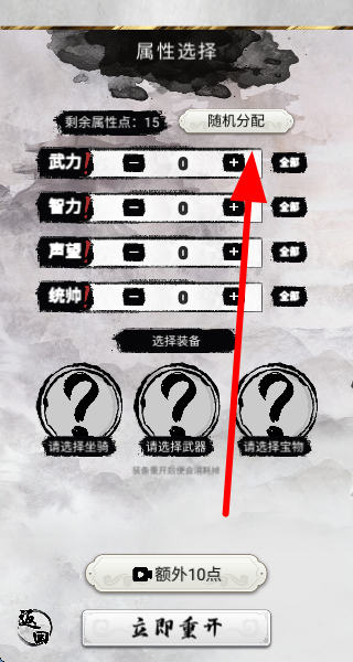 2、在屬性選擇界面,有武力、智力等屬性,可手動(dòng)分配剩余屬性點(diǎn),也能隨機(jī)分配,打造獨(dú)特角色屬性。