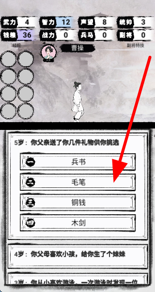 4、在特定年齡段,會(huì)出現(xiàn)物品選擇,比如兵書、毛筆等,選擇不同物品,可能對(duì)角色后續(xù)發(fā)展產(chǎn)生不同影響。