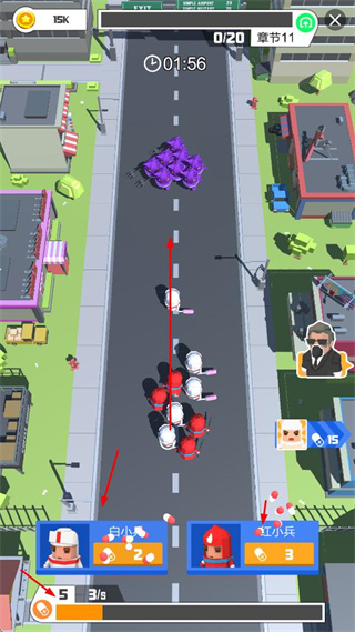 3. 在街道場景中操控不同類型士兵與敵人交戰(zhàn),需關(guān)注士兵數(shù)量、戰(zhàn)斗時間和章節(jié)進度,合理部署以擊敗敵人。