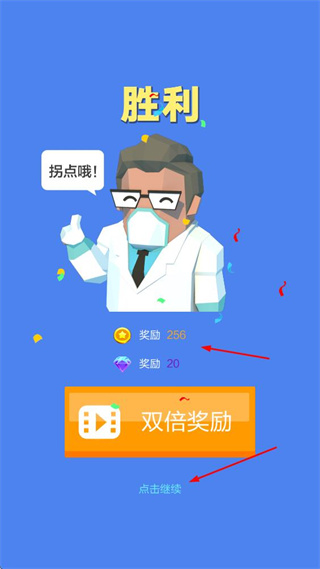 4. 戰(zhàn)斗勝利后可獲得金幣、鉆石獎勵,還可觀看廣告獲取雙倍獎勵,點擊點擊繼續(xù)進入下一環(huán)節(jié)。