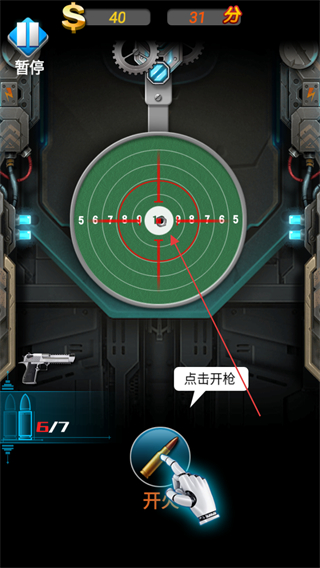 2、進入靶場后,看到屏幕中間的靶子,點擊開火按鈕開槍射擊。
