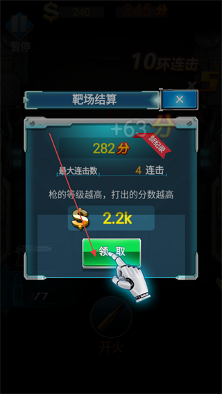4、射擊結(jié)束,查看靶場結(jié)算分數(shù),點擊領(lǐng)取按鈕獲取游戲獎勵。